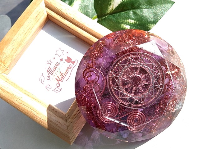 アメジストがたくさん入ったダイヤ型のオルゴナイトです。 太陽のチャームが真ん中に、天使の羽根のチャームがそれを囲むように舞っているかのようなデザインで見る人を癒します。 太陽からさんさんとあふれ出る光のように真っ赤な珊瑚が配置してあり、暖かな癒しと生命力の力強さを感じさせてくれるようです。 アメジストの落ち着いた紫と珊瑚の赤。 それにサンストーンのキラキラ光るアベンチュリンレッセンスは見る人を飽きさせません。 陰と陽のバランスもとれた、とても可愛いオルゴナイトです。 【使用石】 アメジスト 調和・癒し・安らぎ・浄化・精神の安定 赤珊瑚 魔除け・厄除け・安産のお守り・生命力 サンストーン 自信を与える・劣等感の緩和・感情の起伏を抑える・心の余裕を生む 水晶 浄化・生命力の活性化・調和 水晶ポイント 先端に向かうエネルギー・エネルギーを増幅させ放出する ◇ 銅線 銅はエネルギーを伝える金属。 石のエネルギーを伝達することができ、クリスタルのグリッドを強化するようサポートすると言われています。 ◇チャーム◇ 太陽 「太陽」は自ら発光することから、 あらゆる不幸や災いを跳ね飛ばす力があるといわれます。 そのため、太陽モチーフには 「魔除け、力強さと成功、発展・成長・エネルギー・生命力・治癒能力」 などの意味が込められています。 成功したい人・自信を持ちたい人・健康になりたい人などにおすすめです。 その他 羽根、星 【大きさ】 6cm×6cm×3.3cm