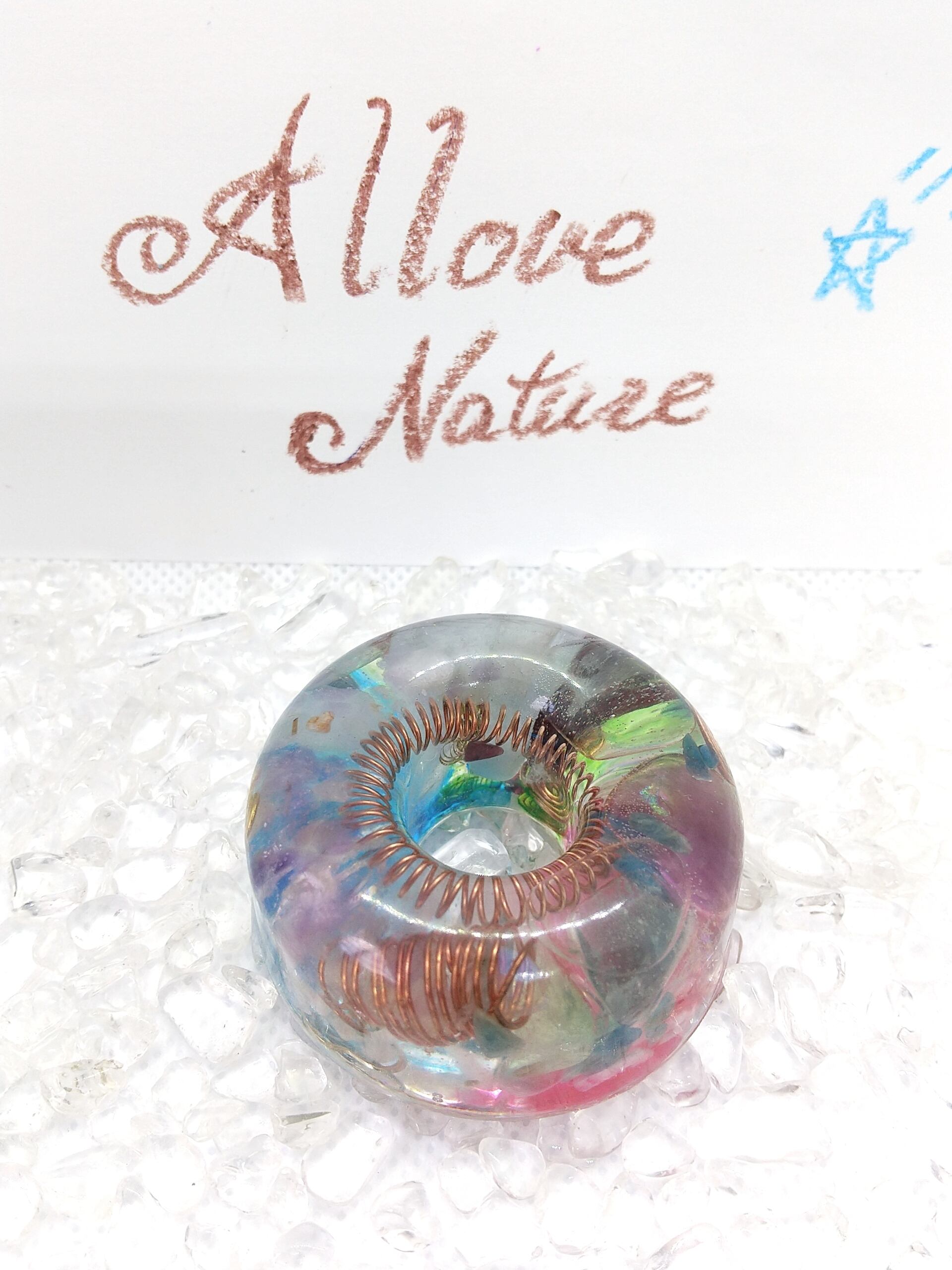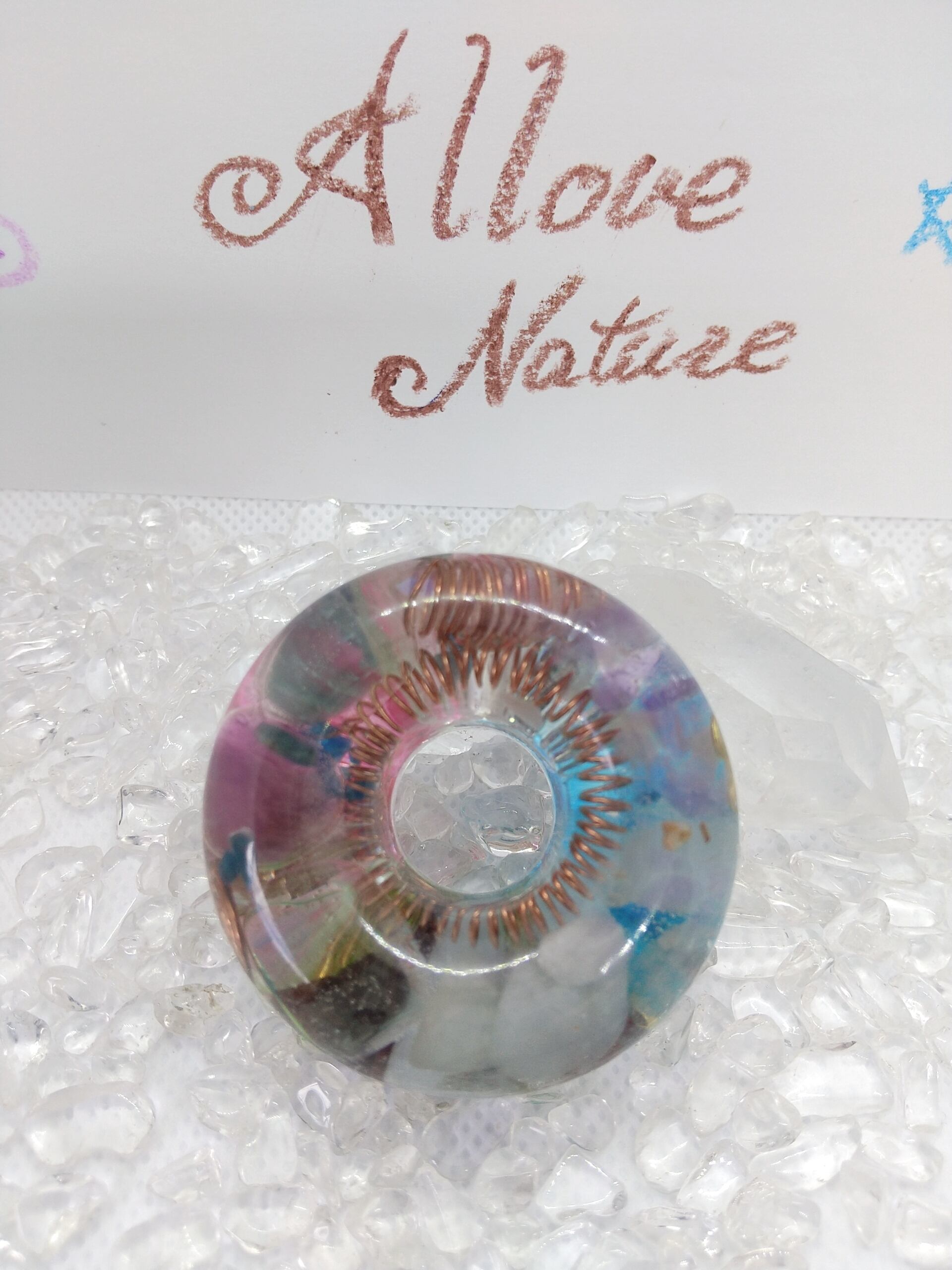 愛と癒しの石を入れた、青 緑 ピンク色のドーナツ型のオルゴナイトです。