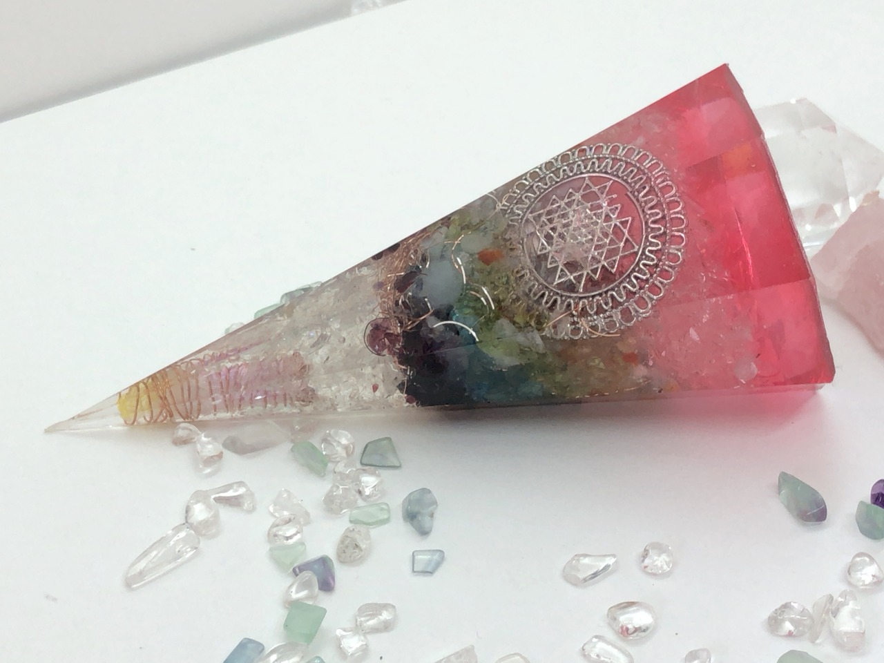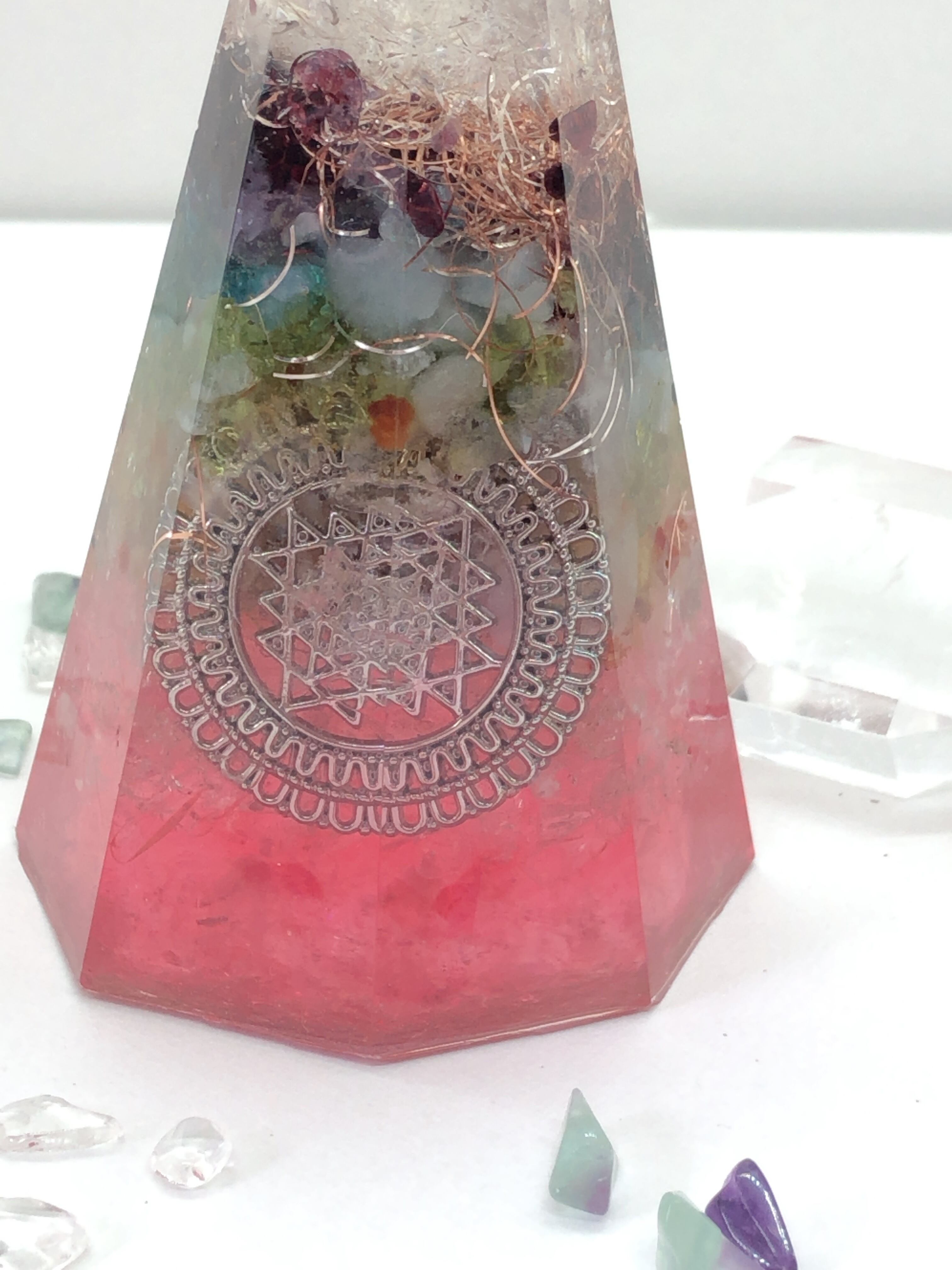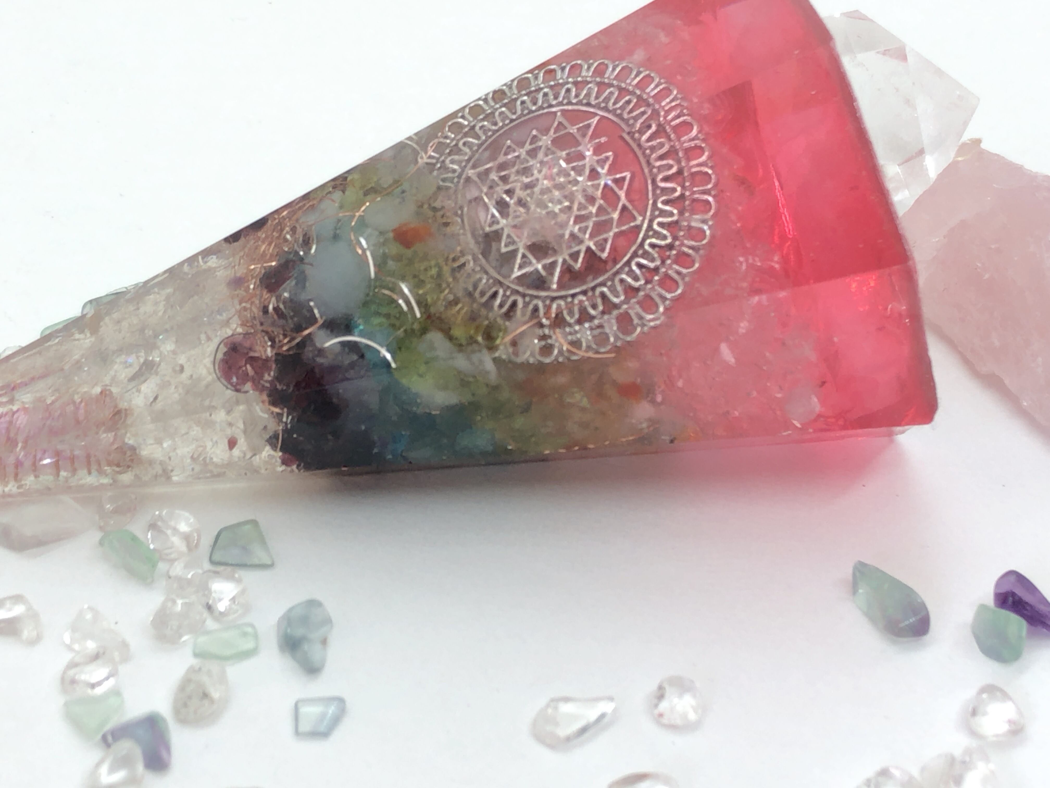 愛と癒しの8角錐 チャクラ天然石 オルゴナイ赤 ピンク T12