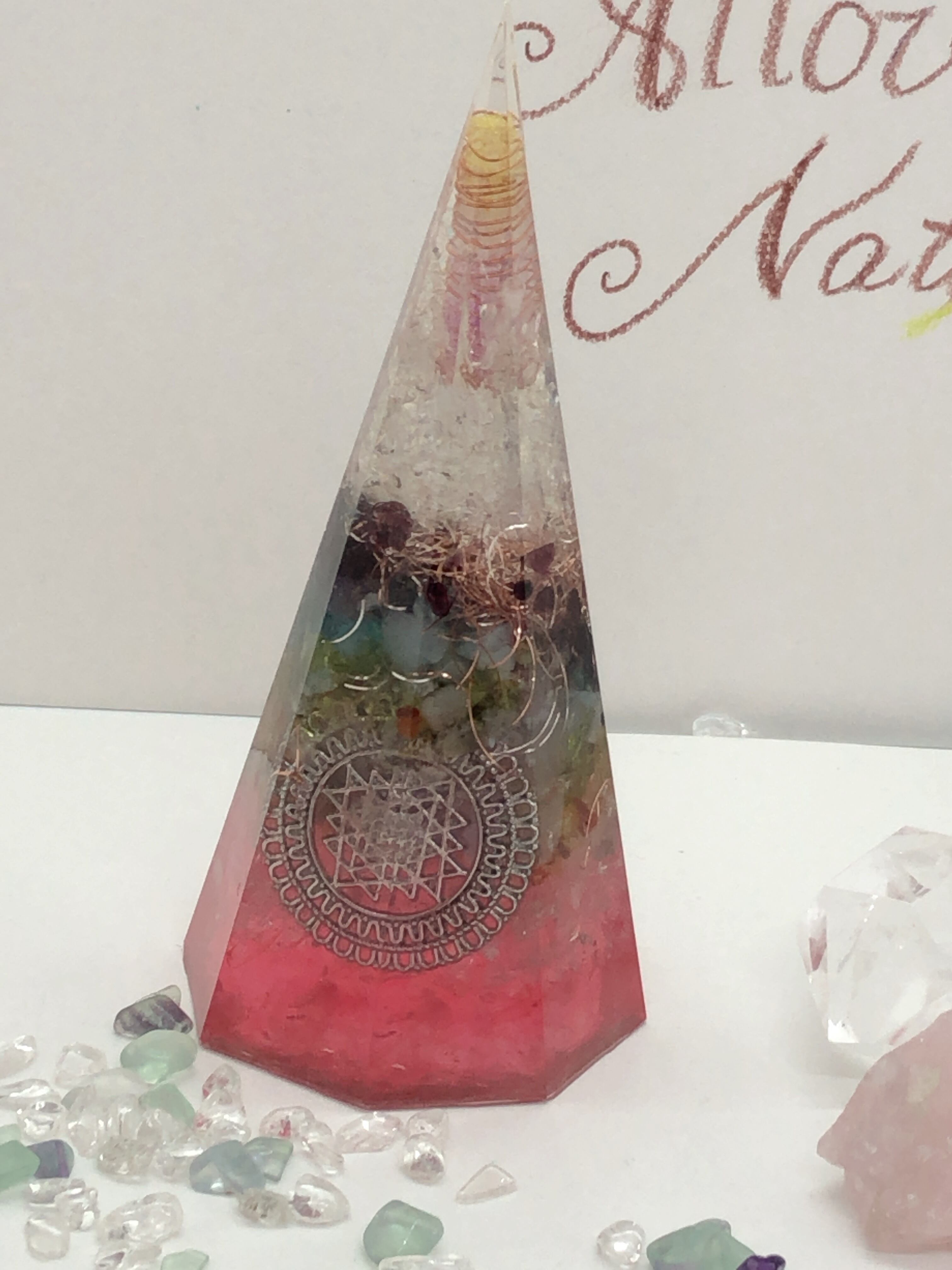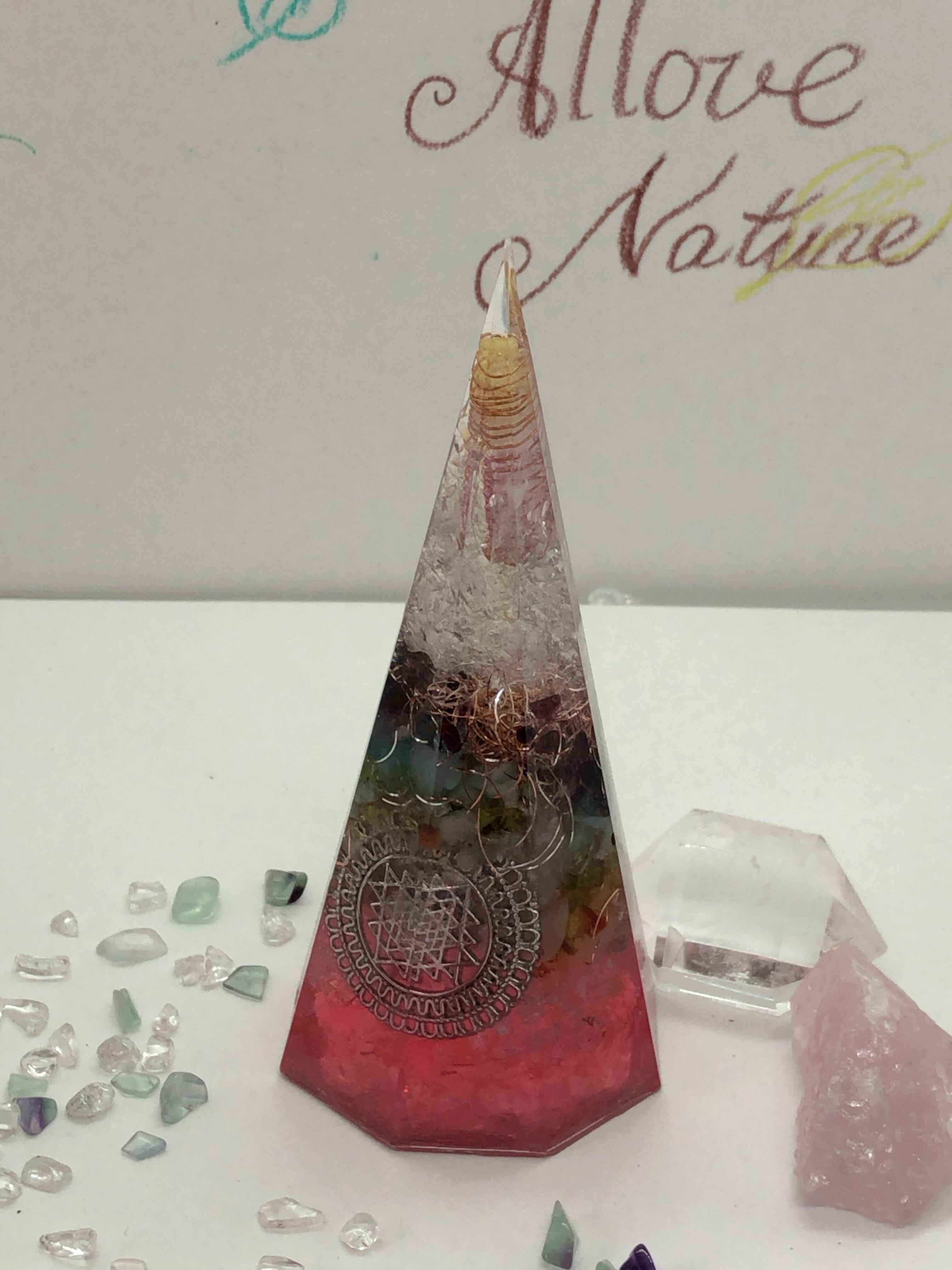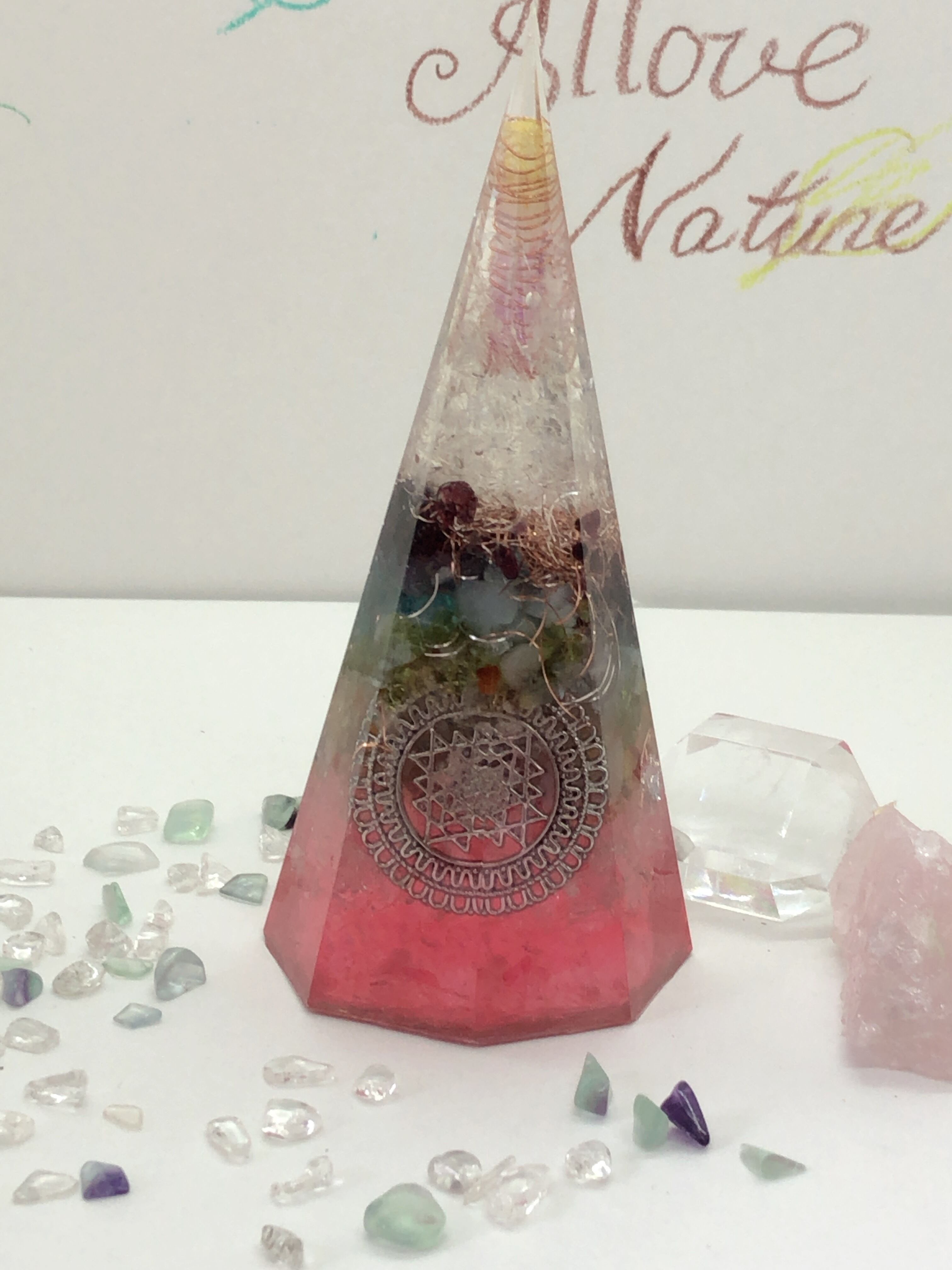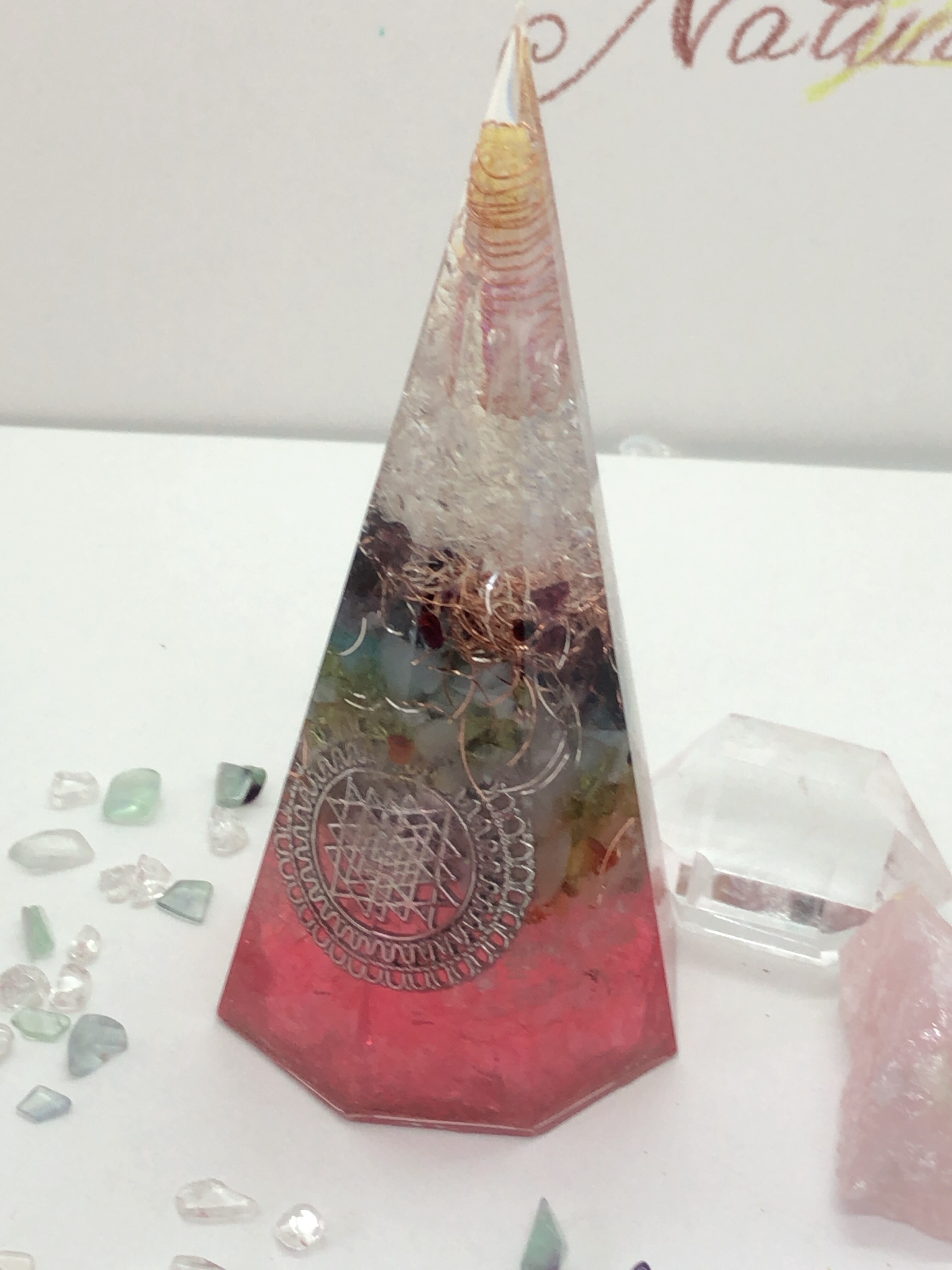 愛と癒しの8角錐 チャクラ天然石 オルゴナイ赤 ピンク T12