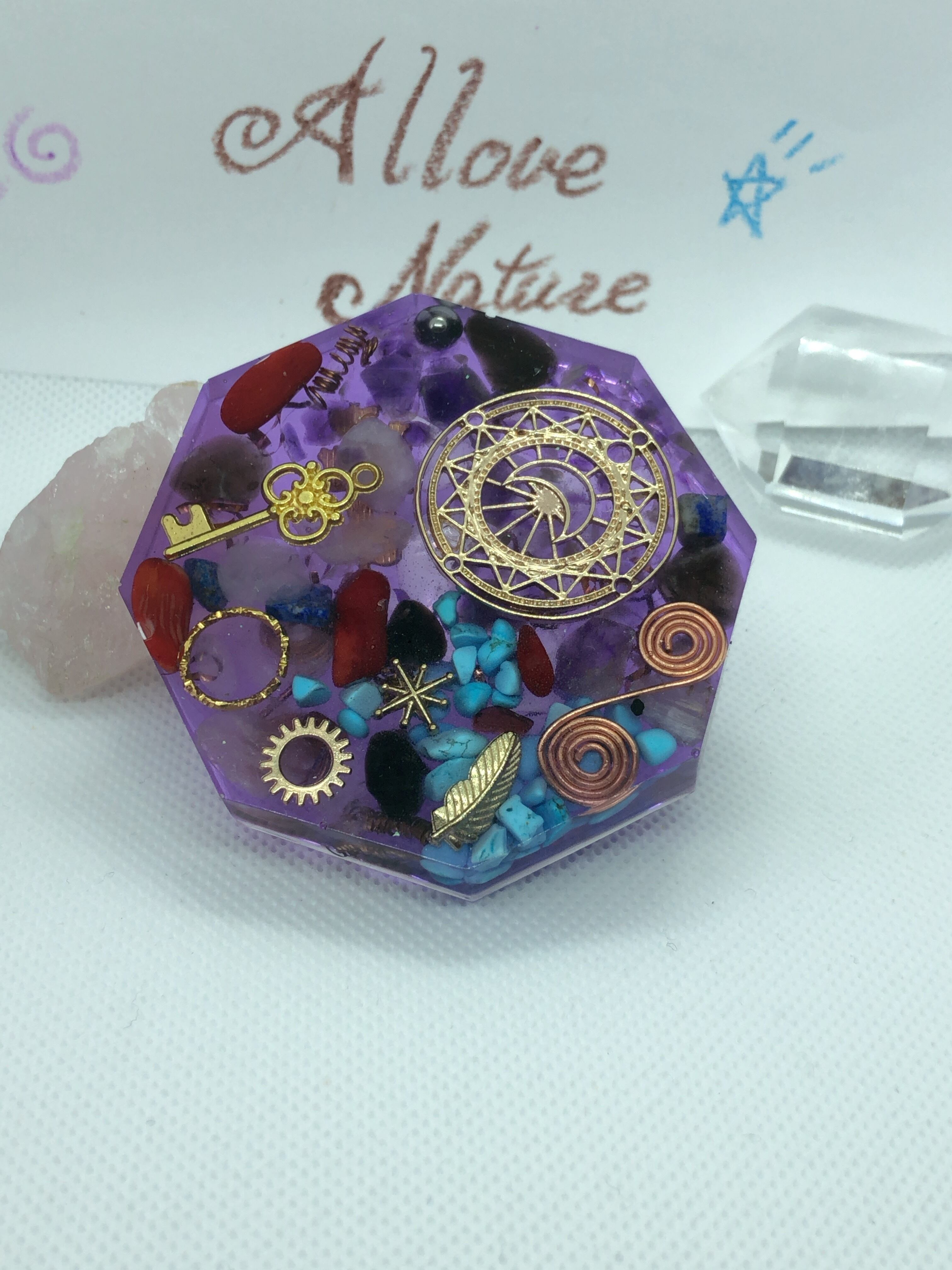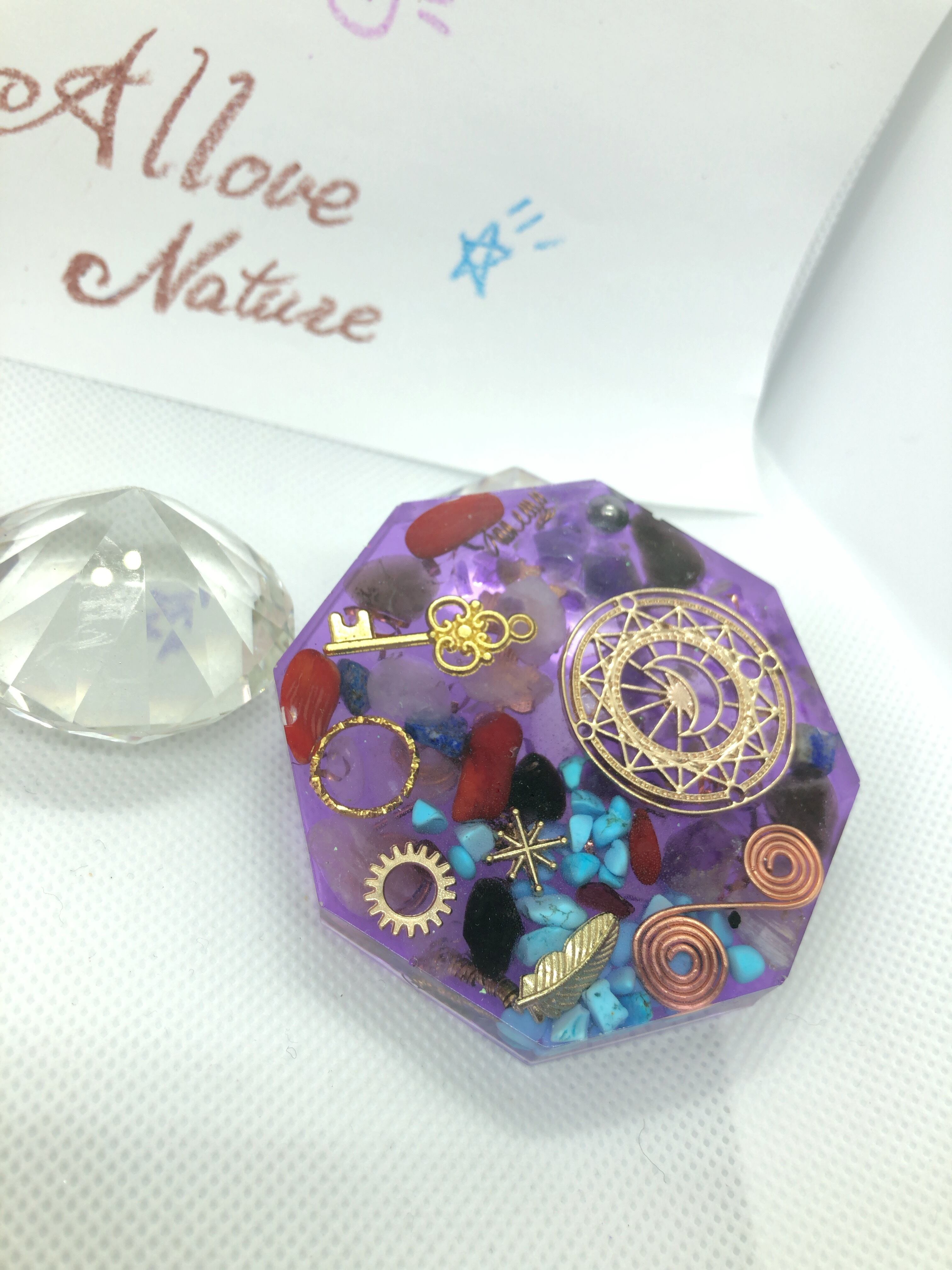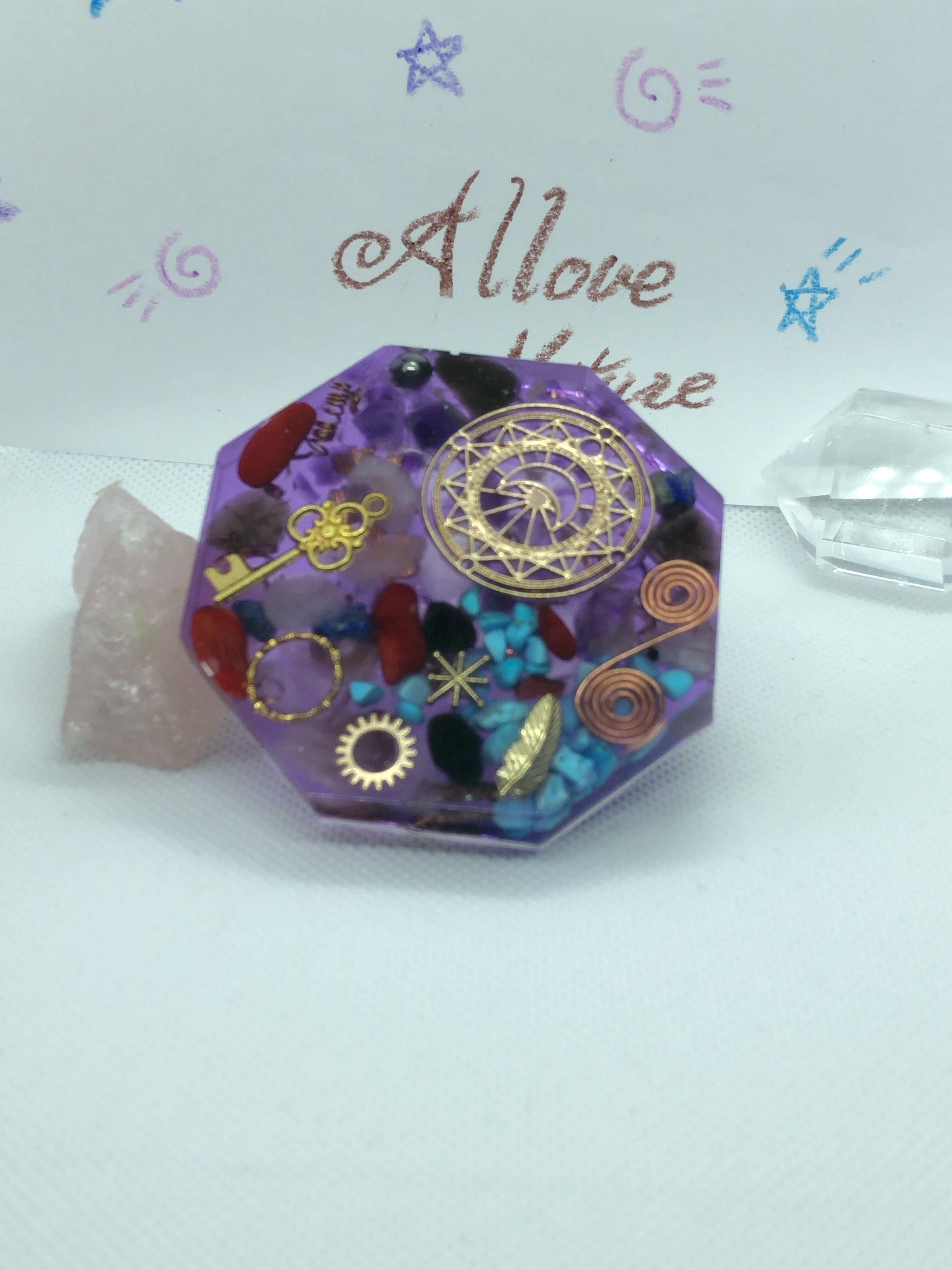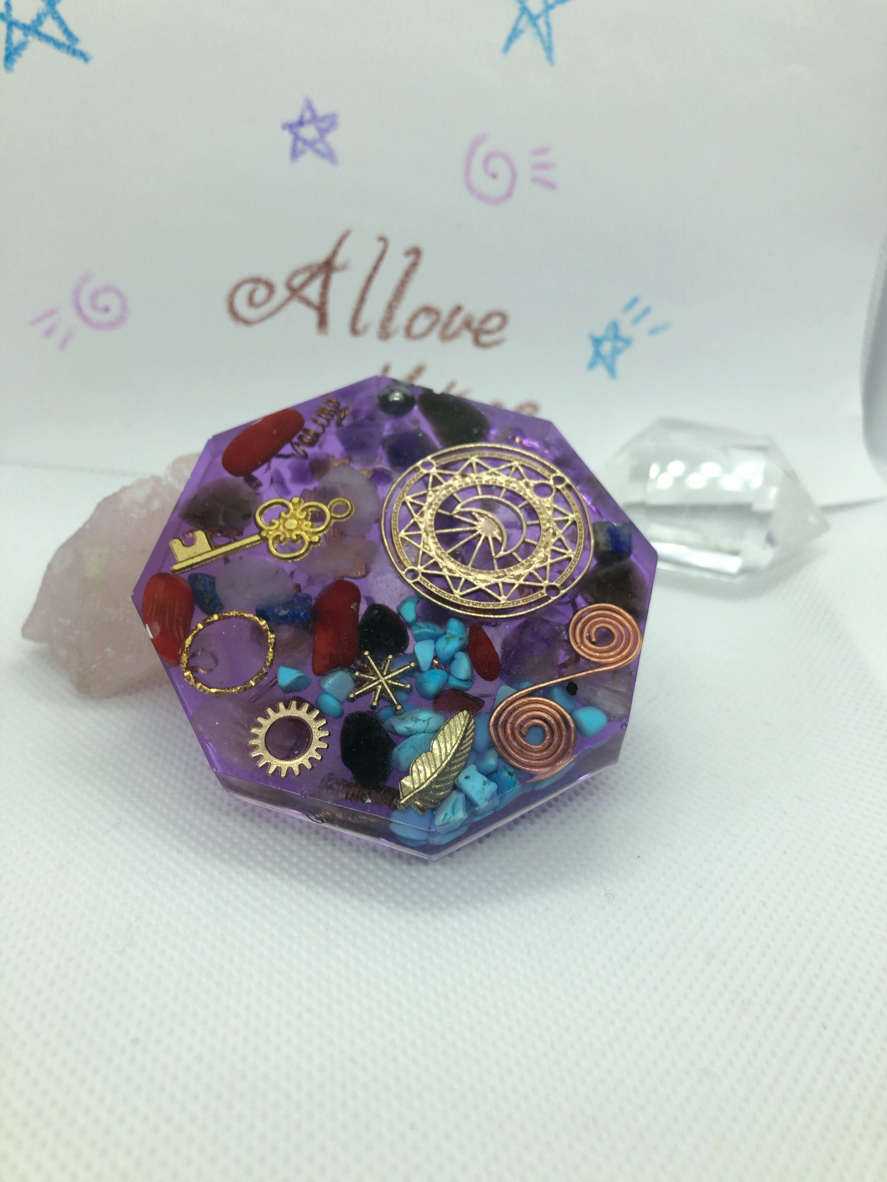 お守り 魔除 コースター型オルゴナイト 紫八角型 T13