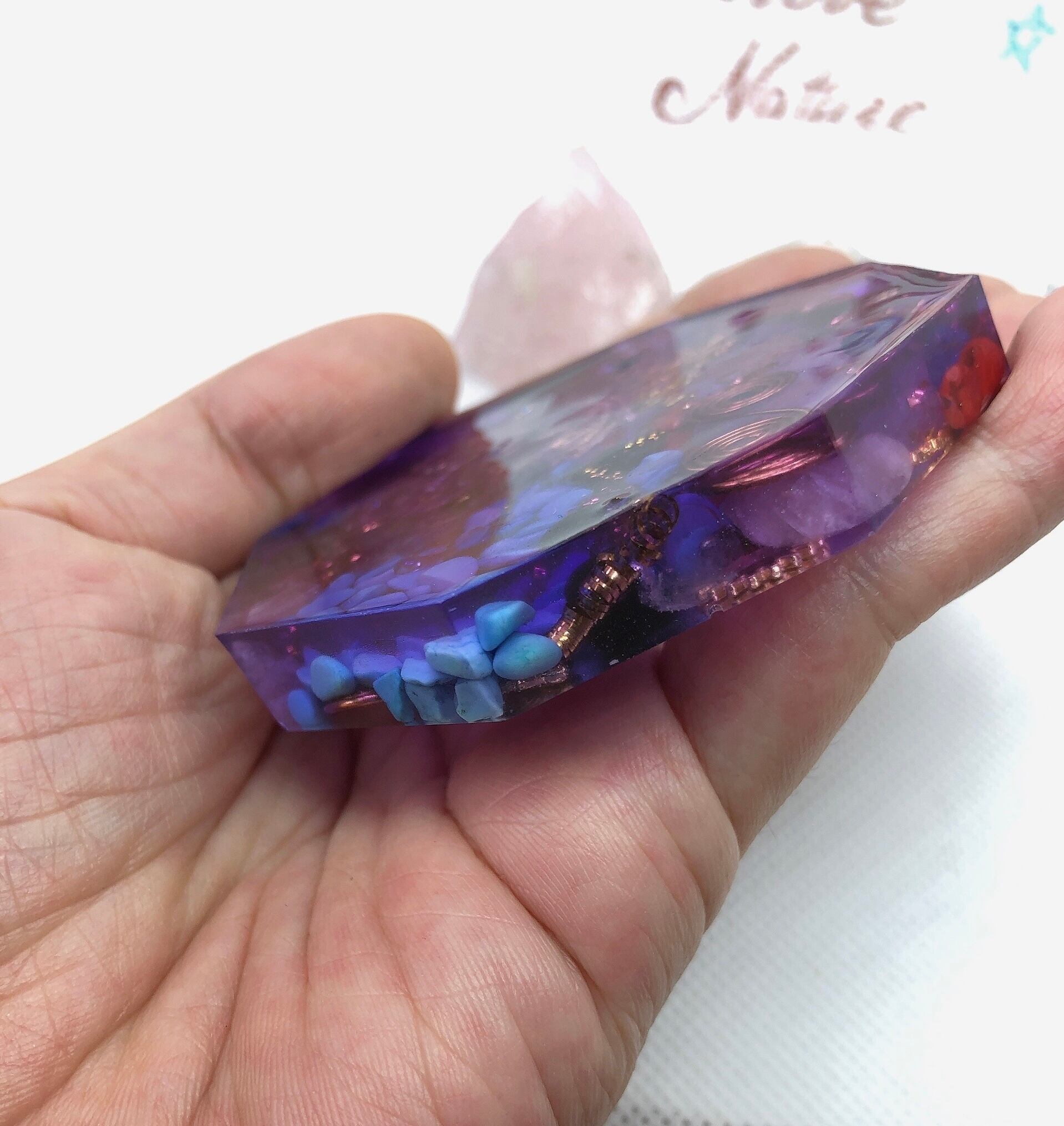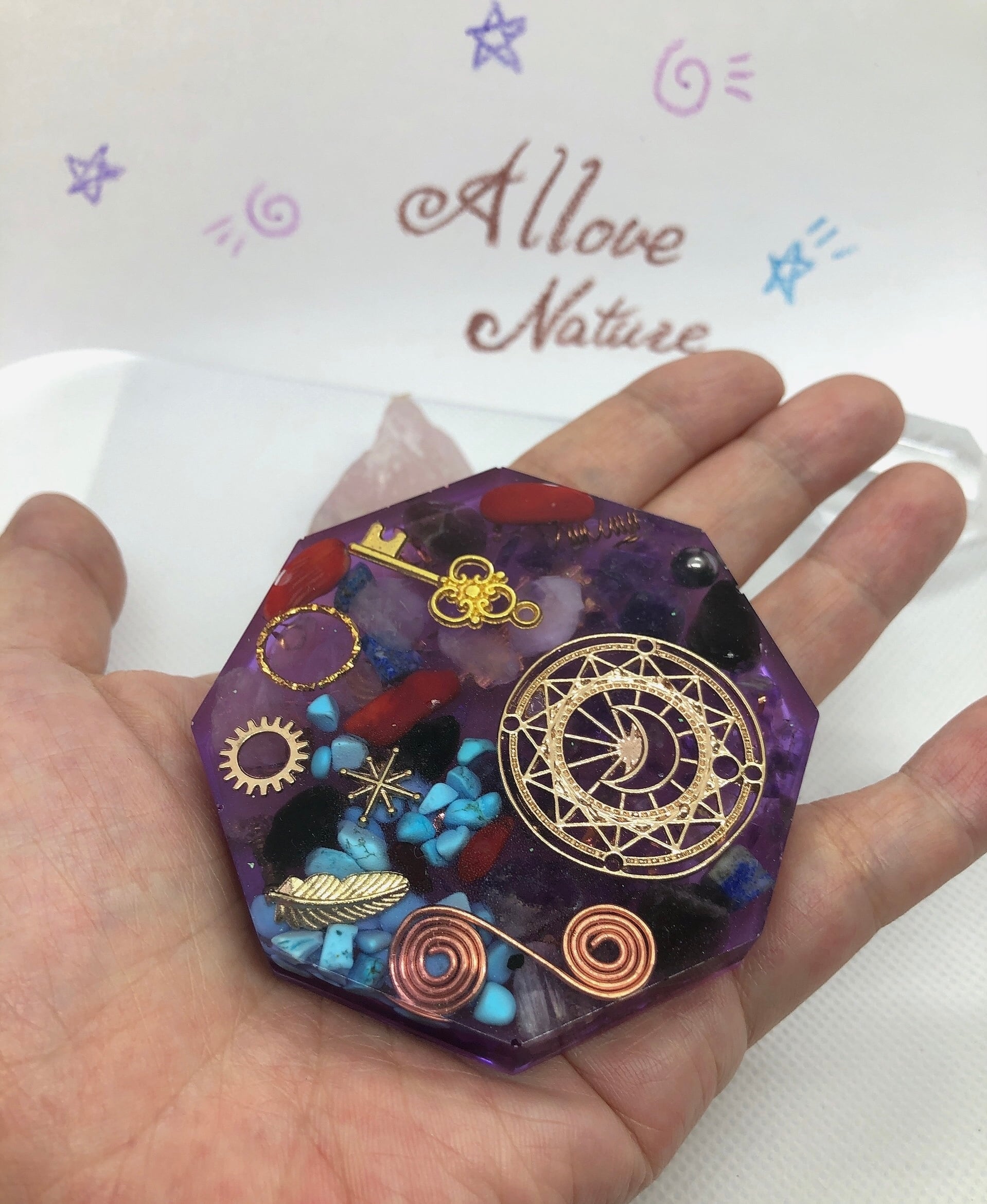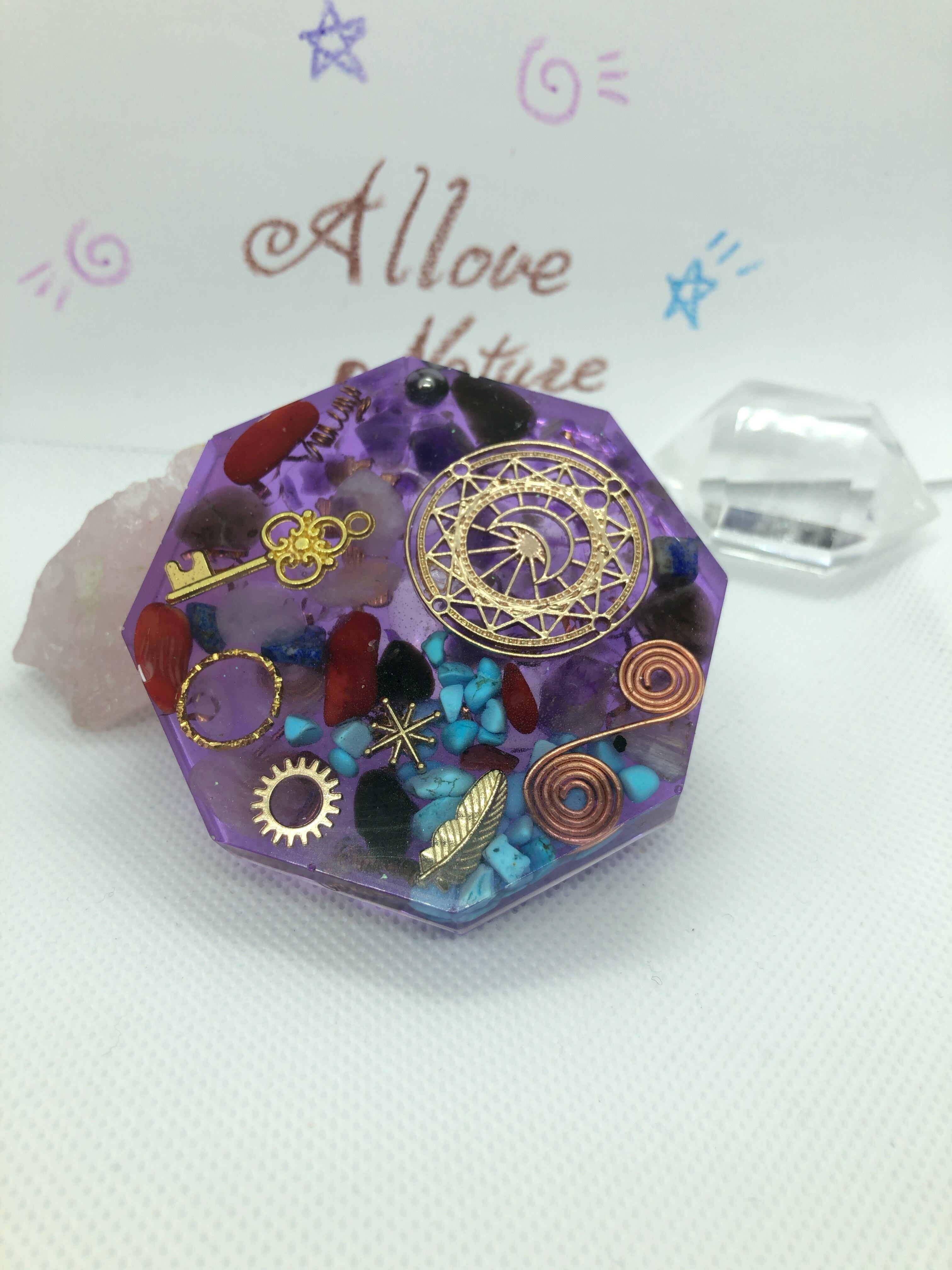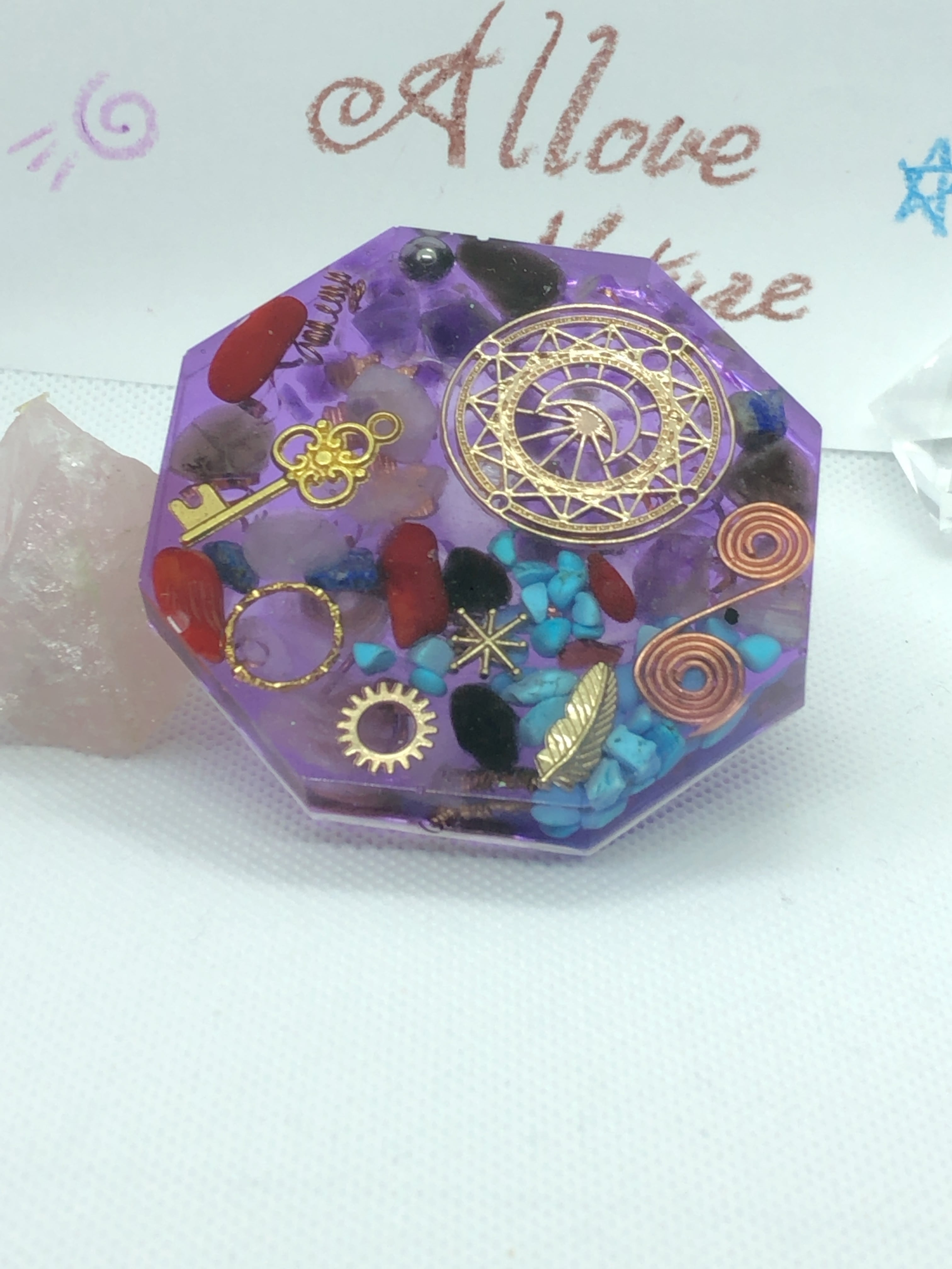 お守り 魔除 コースター型オルゴナイト 紫八角型 T13
