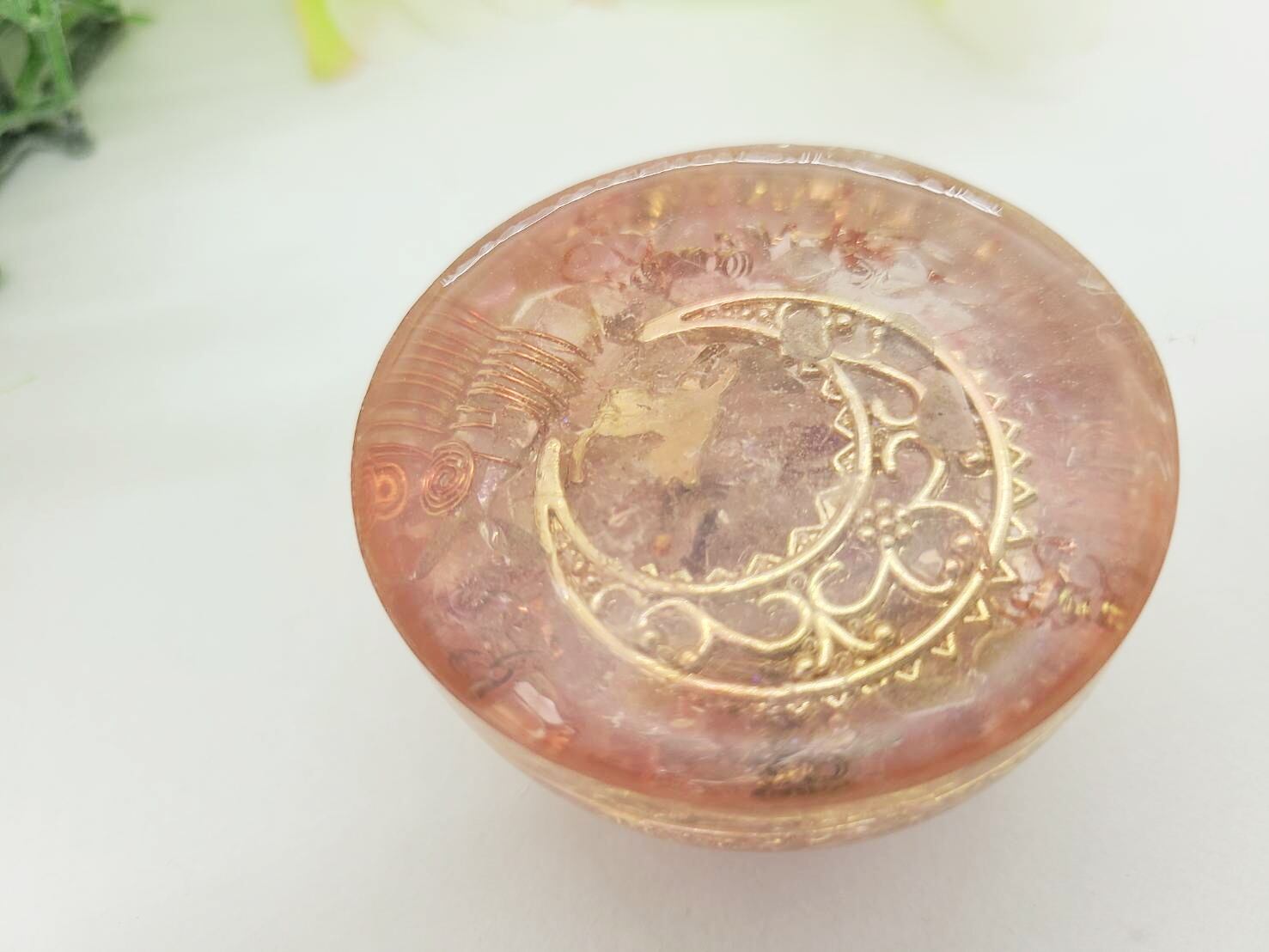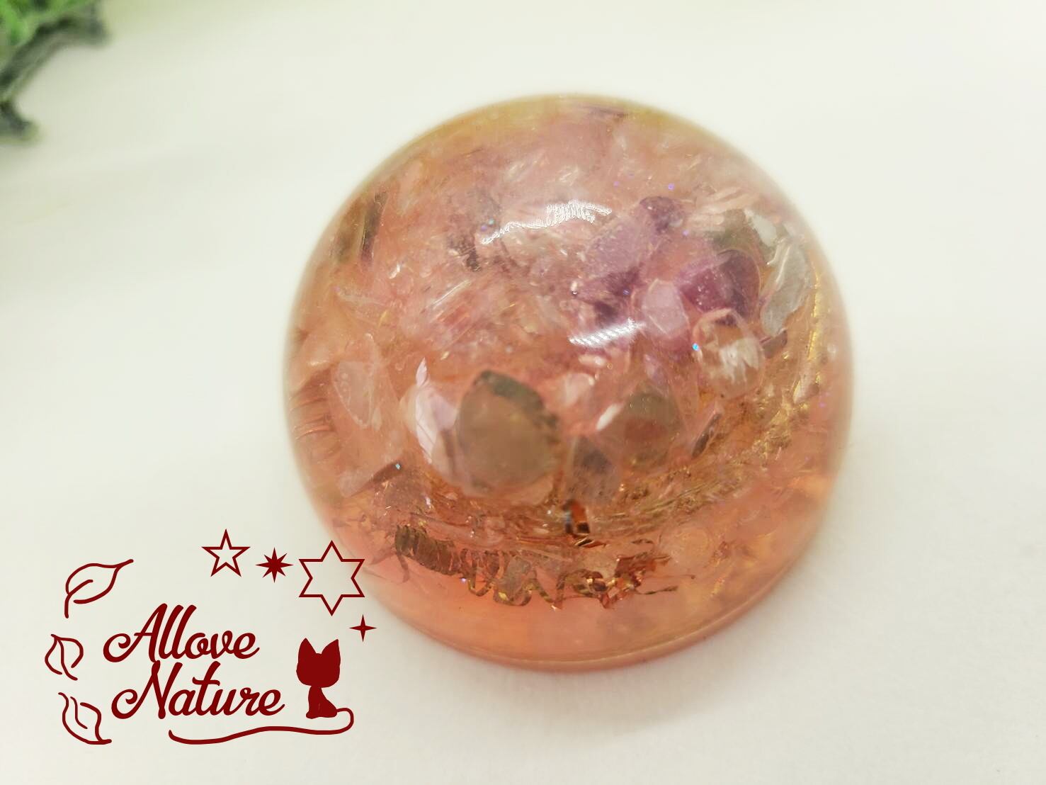 半球型のオルゴナイトの中に、愛と癒やしの石をたっぷりと入れたオルゴナイトです。
