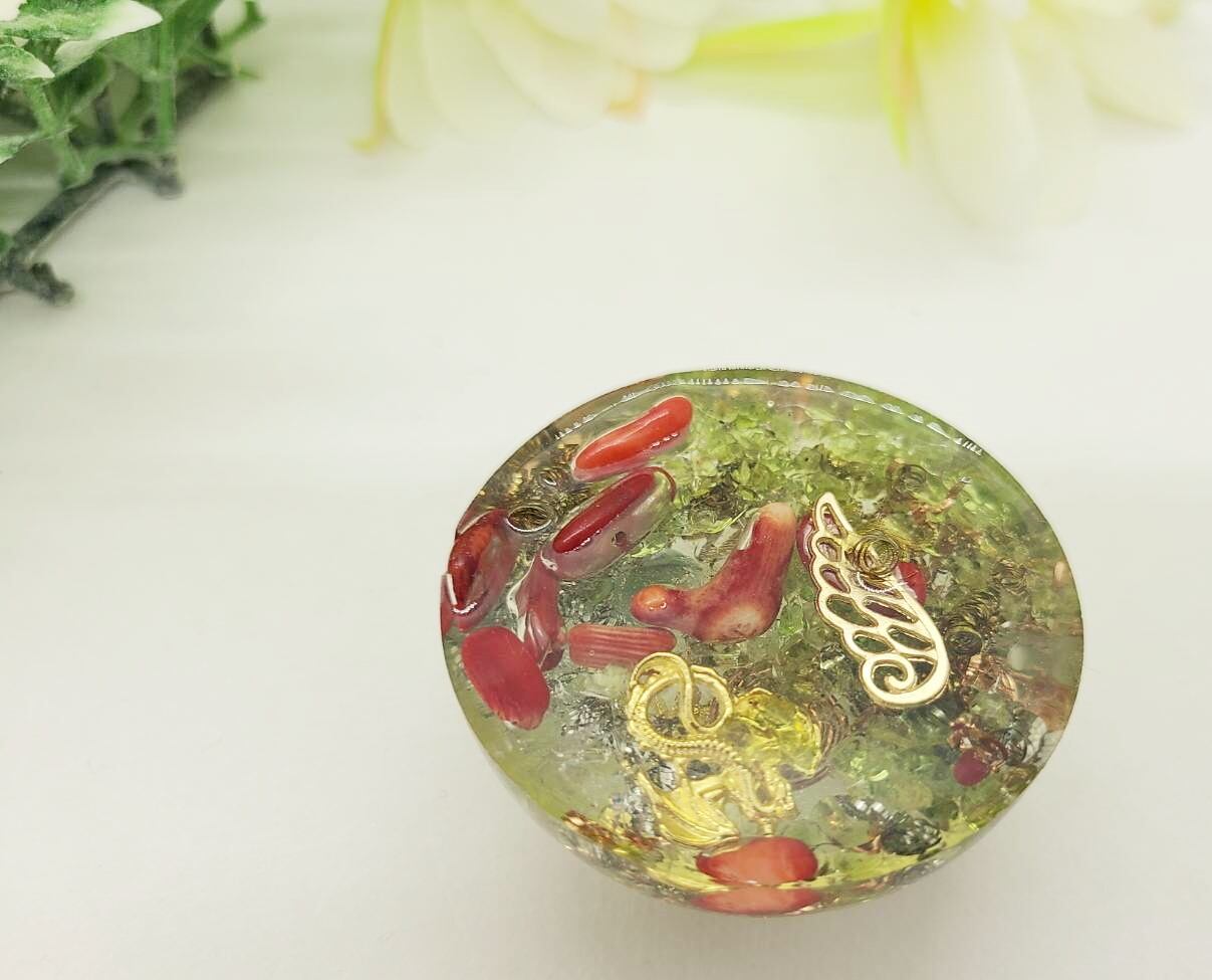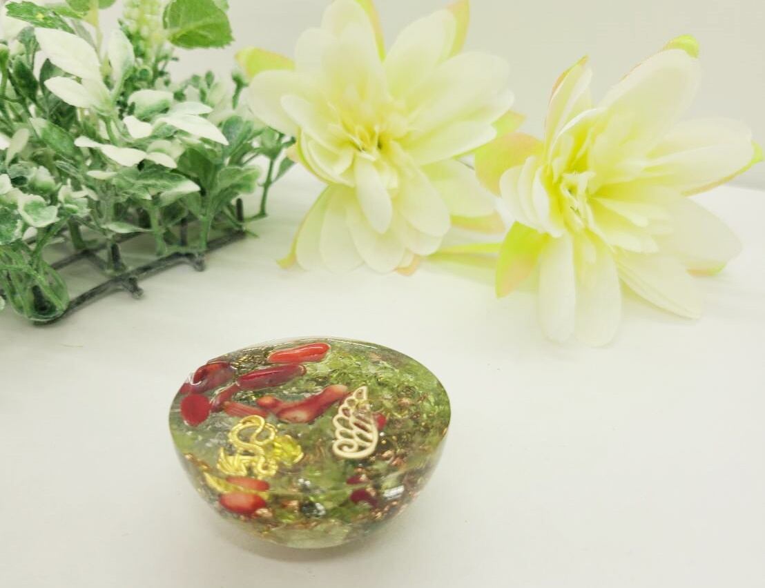 手のひらに乗る様なコロンとした可愛い半球のグリーン色のオルゴナイトに、愛と癒やしの石がたっぷりはいっています。