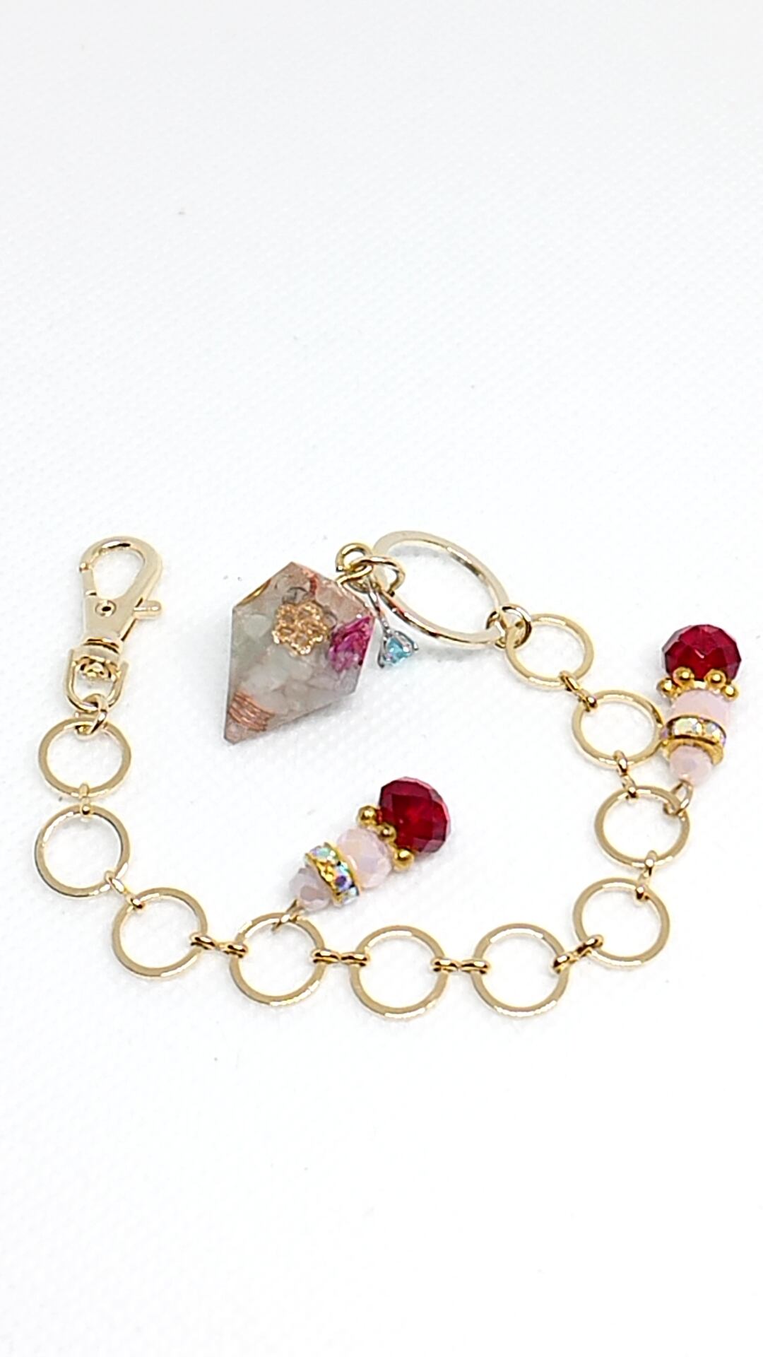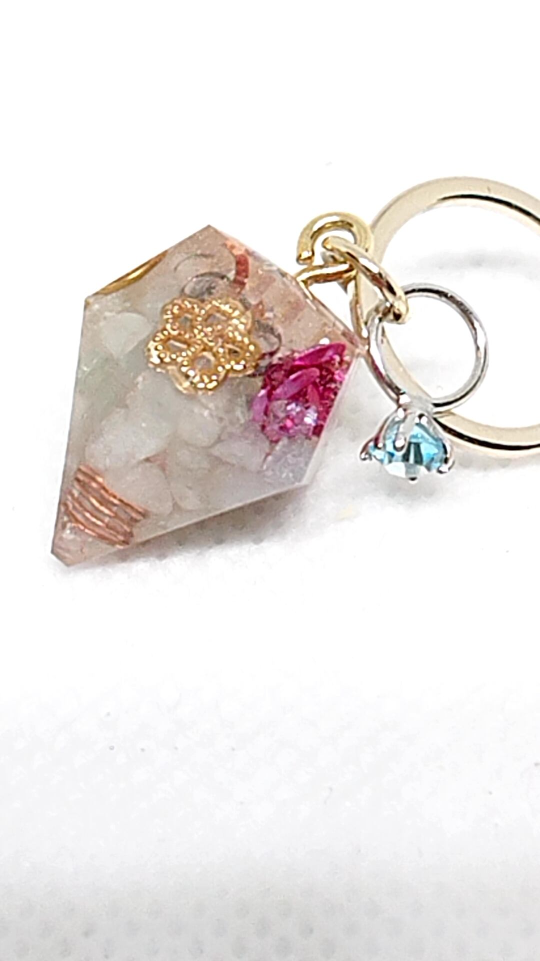 誕生石がついた、リング型チャーム付きのお守りオルゴナイトバックチャームです。