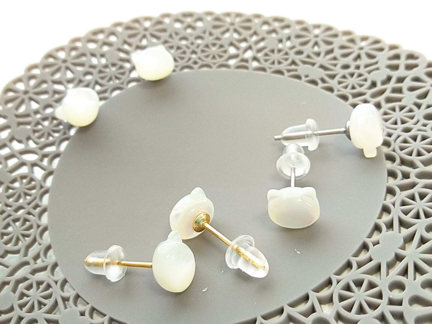 ホワイトシェルで出来た白猫ちゃんのピアスです。